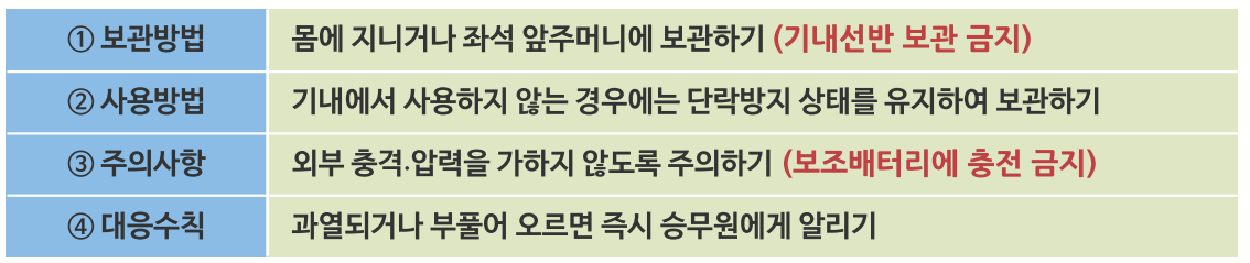 이상 징후 발새 즉시 대응할 수 있도록승객이 몸에 소지하거나, 좌석 주머니에 보관해야 하며기내 선반 보관은 금지됩니다.