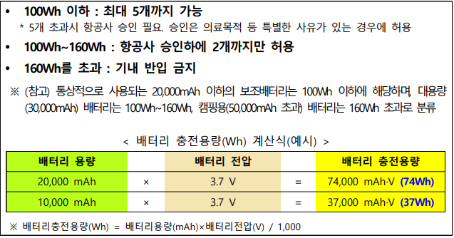 보조배터리의 기내 반입 기준은 배터리 충전용량(Wh)에 따라 다르며,